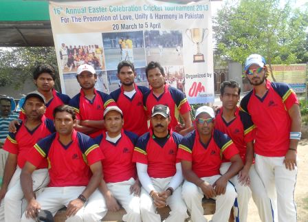 16th Annual Easter Celebration Cricket Tournament:20 March to 15 April 2013.The purpose of the tournament is the promotion of love, unity and harmony in Pakistan. It was a great tournament among 12 teams. It was a good opportunity to serve 180 players. There were 2 players from Muslim community in each team. It was a time of competition, excitement, fellowship, joy, sadness, the taste of victory and defeat.